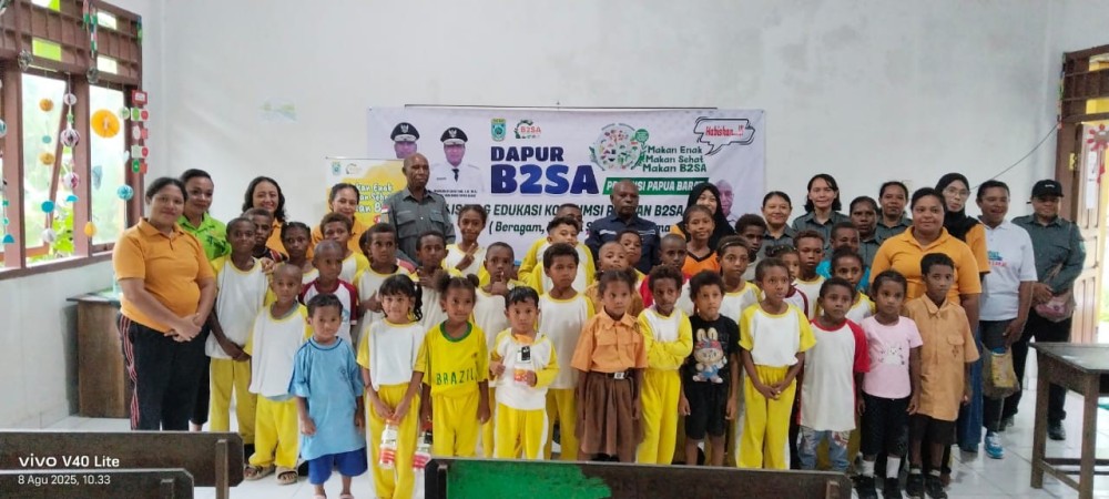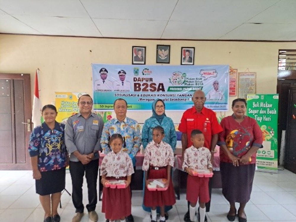 Manokwari, 28 Agustus 2025, Untuk menciptakan generasi yang sehat, aktif dan produktif, Dinas Ketahanan Pangan Papua Barat menggelar kegiatan Dapur B2SA meliputi Sosialisasi dan edukasi tentang pangan B2SA. Kegiatan dilaksanakan bertempat di SD Inpres 09 Anggori Manokwari. Kegiatan dibuka oleh Asisten 1 Bidang Administrasi Umum Bpk. Otto Parorongan, SKM., M. Kes. Turut hadir dalam acara pembukaan juga Wakil Ketua TP-PKK Papua Barat, Ny. Lani Lakotani, dan Perwakilan TP-PKK Kabupaten Manokwari serta Perwakilan Dinas Pertanian dan Ketahanan Pangan Kabupaten Manokwari serta undangan lainnya.Sosialisasi dan Edukasi Pangan B2SA dibawakan oleh pemateri dari Persagi Papua Barat Bpk. Andry E. Parinussa, Yang diikuti oleh seluruh Siswa/i kelas 1 s/d 6, Dewan Guru serta Tamu Undangan.